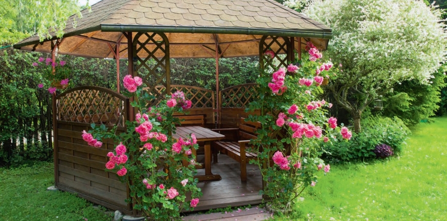 Nieodłącznym elementem altany są wspinające się po jej ażurowych ściankach pnącza – dzięki nim zyskujemy intymność, a przy tym tworzą klimat, zacieniając jej wnętrze. Niezwykle dekoracyjnie wyglądają choćby powojniki. Mają bardzo efektowne kwiaty – najbardziej okazałe należą do odmian wielokwiatowych. W zależności od gatunku i odmiany rozwijają się od maja do października. Do wczesno kwitnących należą choćby 'Anna German' czy 'Hania'. Późno kwitnące to m.in. 'Biały Anioł', 'Rasputin' czy 'Mazury'.