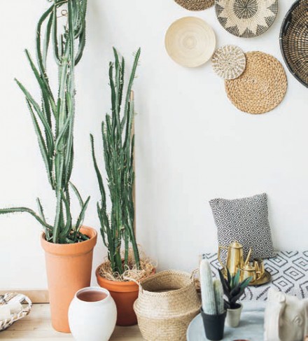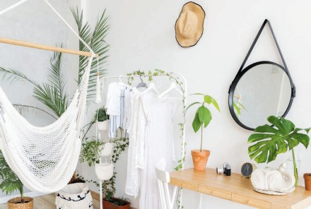 Letni wymiar stylizacji boho to przede wszystkim zwiewne, delikatne, transparentne tkaniny. Tekstylne dodatki, które stworzą klimat, powinny oscylować w barwach kojarzących się z latem, a więc pastele w odcieniach piasku, błękity w kolorze morskiej wody, jasne, przytłumione zielenie suchych traw wydmowych. Ręcznie tkane dywaniki, kapy i pledy, dziergane na szydełku pokrowce na poduszki, obrusy i serwety to dopełnienia, które nadadzą wnętrzu ciepłego, przyjaznego charakteru. Boho to styl, w którym doskonale odnajdują się wszelkie plecionki: makramy jako dekoracje ścienne, łapacze snów, wiszące kwietniki na doniczki, wyplatane z trawy morskiej kosze jako pojemniki do przechowywania, rattanowe i wiklinowe fotele i sofy czy wreszcie hamaki i podwieszane huśtawki, szczególnie lubiane w autorskich stylizacjach. W letnich wnętrzach boho nie może zabraknąć też roślin i dodatków wprost z natury. Dekoracyjną rolę odgrywają ptasie pióra, wysuszone trzciny i trawy (zwłaszcza te o bujnych pióropuszach), pnie i gałęzie najlepiej wypłukane wodą morską, kamienie i muszle z najbardziej egzotycznych plaż. Przewodnią rolę grają również rośliny doniczkowe, których szeroka reprezentacja eksponowana w różnorodnych ceramicznych, szklanych, drewnianych pojemnikach ma za zadanie podkreślać ważną dla gospodarza bliskość przyrody. W letnim wydaniu aranżacji w stylu boho doskonale odnajdą się rośliny kojarzone z gorącymi regionami świata – kaktusy, grubolistne sukulenty oraz palmy.