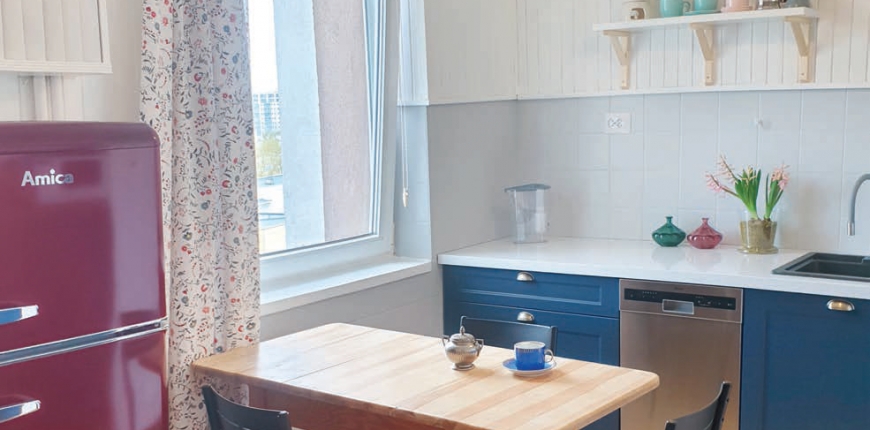 Dyscyplina finansowa przyniosła niespodziewanie dobre rezultaty na etapie wyposażania. Każde z pomieszczeń zostało wzięte pod lupę osobno – ustalono minimalny zakres zmian, który zapewniałby akceptowalny efekt. W łazience, która była remontowana przez rodziców nie tak dawno, wystarczyła zmiana szafek, lustra, umywalki i oświetlenia. Odświeżenie fug i pomalowanie sufitu wzmocniło niezbędny efekt świeżości. Najwięcej do życzenia pozostawiało mocno podniszczone wyposażenie kuchni. Poza drewnianym cepeliowskim kredensem, który Kasia i Marcin postanowili zabrać do domku letniskowego, obroniła się jedynie wolno stojąca kuchenka i okap. Pozostałe AGD i szafki trzeba było wymienić, ale nowa zabudowa nie była tak kosztowna. Aby zachować przestrzenny charakter osobnej kuchni, inwestorzy postanowili ograniczyć liczbę mebli do minimum, postawili natomiast na efekt kolorystyczny. Nieco ekscentryczna bordowa lodówka w stylu retro, kilka zaledwie szafek w kolorze granatowym i nowoczesny drewniany barek zagrały jako wyraziste akcenty kolorystyczne na tle białej boazerii oraz pomalowanej na szaro starej okładziny z płytek ceramicznych. Po wyczyszczeniu i ponownym polakierowaniu swoje drugie życie uzyskał stary stół, któremu dla odświeżenia dodano do towarzystwa metalowe krzesełka. W nowej aranżacji kuchni nie obyło się jednak bez niespodzianek. Ze względu na obawy związane z nośnością boazeryjnej ściany już podczas montażu zabudowy zrezygnowano z zawieszania nad blatem zamówionych szafek. Po zamontowaniu do nich nóżek i przykryciu blatem utworzyły wygodny bufet. Wątpliwości nie budził zakres remontu małego pokoju. Należący niegdyś do Marcina był od podłogi do sufitu zabudowany szafkami, które zacieśniały przestrzeń. Po ich demontażu powstała wygodna sypialnia. Pokój dzienny to jasne, dobrze oświetlone pomieszczenie – pomalowanie ścian na biało i odciążenie go z nadmiaru mebli wydobyło atrakcyjną przestrzeń. Obecna aranżacja to udane połączenie starego z nowym. Nowoczesna komoda w parze z popartowską tapicerką krzesła to dobra przeciwwaga dla starej biblioteczki. Stół z ciemnego drewna odświeżono kolorowymi krzesłami w stylu James, przyciężki wypoczynek odmłodniał dzięki sąsiedztwu białych stoliczków patyczaków. Całość spajają ulubione przez Kasię plakaty i nowe oświetlenie. Choć działania remontowe i aranżacyjne były dynamiczne, pozwoliły na osiągnięcie pierwotnego zamysłu nowych właścicieli – odświeżenie mieszkania w zgodzie z trendami i własnymi gustami przy zachowaniu szacunku dla pamięci rodziców.