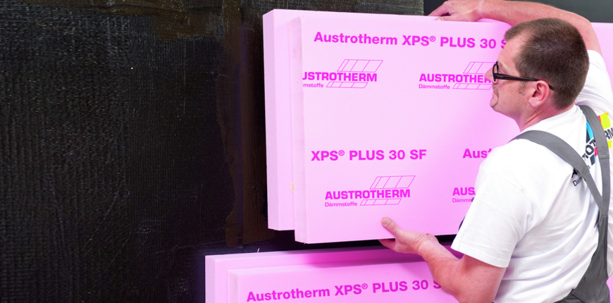 Ściany fundamentowe narażone są na działanie wilgoci przenikającej z otaczającego budynek gruntu, dlatego należy je odpowiednio zaizolować. Styrodur na fundamenty stosuje się inaczej niż na płytę fundamentową. Izolacja termiczna układana jest „obwodowo” na całej ścianie fundamentowej budynku po jej zewnętrznej stronie od poziomu ławy fundamentowej do miejsca, w którym zaczyna się izolacja  termiczna ściany zewnętrznej. Grubość izolacji termicznej wykonanej z płyt XPS wynosi zazwyczaj od 10 cm do 30 cm (dla domów pasywnych). Kluczowe jest, aby całość izolacji – przeciwwodna i termiczna – była wykonana prawidłowo. Zabezpieczenie ścian fundamentowych powinno składać się z wodoszczelnej izolacji pionowej wykonanej przy użyciu masy izolacyjnej oraz osłony w postaci wodoodpornych termoizolacyjnych płyt XPS, które ochronią ją zarówno przed uszkodzeniami mechanicznymi, jak i utratą ciepła. W takim przypadku obligatoryjnie należy użyć izolacji wodoszczelnej oraz kleju dedykowanego do płyt XPS – to kleje bitumiczne lub kleje poliuretanowe. W przeciwnym wypadku zawarte w tych materiałach rozpuszczalniki doprowadzą do degradacji izolacji termicznej fundamentu. Prawidłowo dobrane kleje gwarantują również odpowiednią przyczepność przy klejeniu płyt. W przypadku niskiego poziomu wody gruntowej zaleca się klejenie płyt na placki lub pionowe warkocze w zależności od zastosowanego kleju. Płyty XPS przyciąć trzeba na wymiar za pomocą specjalnych narzędzi – sprawdzają się piła z bardzo małymi ząbkami, nóż termiczny, który pracuje z temperaturą 100-450°C lub ploter termiczny. Płyty XPS kleimy do ściany „mijankowo”, tzn. z przesunięciem spoin płyt o 1/2 ich długości, płyty należy łączyć na zakład z wykorzystaniem krawędzi L. Mogą być one układane poziomo lub pionowo w zależności od rozwiązań projektowych. Uwaga! Płyt XPS w żadnym wypadku nie należy mocować mechanicznie. Zasypanie fundamentów gruntem może nastąpić dopiero po zabezpieczeniu ich folią kubełkową i wyschnięciu kleju.