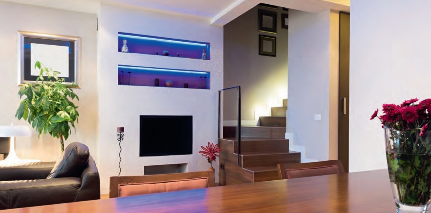 We wnętrzach przeważnie wykorzystujemy taśmy przystosowane do napięcia 12 V. Najczęściej stosujemy zewnętrzny zasilacz, którego montaż wymaga odpowiednio dużo przestrzeni – po instalacji zasilacza najlepiej miejsce montażu zamaskować, tak aby było niewidoczne. Jeśli tam, gdzie zaplanowaliśmy usytuowanie zasilacza nie ma przygotowanego zasilania, należy je doprowadzić z puszki rozdzielczej lub najbliższego gniazdka. Trzeba też pamiętać, że jeden zasilacz wystarcza na 6 m taśmy. Gdy planujemy więcej oświetlenia liniowego, konieczna będzie większa liczba zasilaczy. Jednak dzisiaj podłączenie do stałego źródła prądu nie jest już koniecznością, na rynku są dostępne taśmy z opcją zasilania bateryjnego. Taśmy z diodami RGB wymagają sterownika. Jeśli nie ukryjemy w bruzdach ściennych lub w pustce pod okładziną z płyt g-k instalacji, zasilacza, sterownika czy przewodów, pozostaną one widoczne i będą szpecić wnętrze, a efekt estetyczny będzie bardzo połowiczny. Taśmy LED najlepiej montować w profilach aluminiowych, które dobrze odprowadzają ciepło i wydłużają ich żywotność. W przypadku, gdy zostaną przyklejone bezpośrednio do drewna, płyt kartonowo-gipsowych lub ściany murowanej tracą szybciej nie tylko trwałość, ale też moc świecenia.