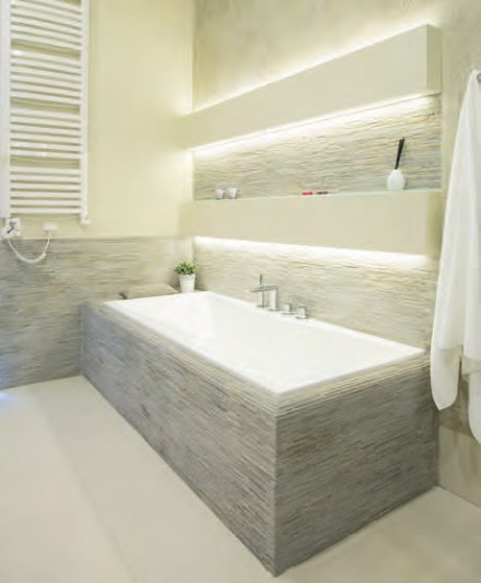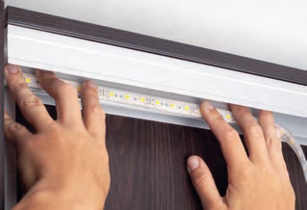 We wnętrzach przeważnie wykorzystujemy taśmy przystosowane do napięcia 12 V. Najczęściej stosujemy zewnętrzny zasilacz, którego montaż wymaga odpowiednio dużo przestrzeni – po instalacji zasilacza najlepiej miejsce montażu zamaskować, tak aby było niewidoczne. Jeśli tam, gdzie zaplanowaliśmy usytuowanie zasilacza nie ma przygotowanego zasilania, należy je doprowadzić z puszki rozdzielczej lub najbliższego gniazdka. Trzeba też pamiętać, że jeden zasilacz wystarcza na 6 m taśmy. Gdy planujemy więcej oświetlenia liniowego, konieczna będzie większa liczba zasilaczy. Jednak dzisiaj podłączenie do stałego źródła prądu nie jest już koniecznością, na rynku są dostępne taśmy z opcją zasilania bateryjnego. Taśmy z diodami RGB wymagają sterownika. Jeśli nie ukryjemy w bruzdach ściennych lub w pustce pod okładziną z płyt g-k instalacji, zasilacza, sterownika czy przewodów, pozostaną one widoczne i będą szpecić wnętrze, a efekt estetyczny będzie bardzo połowiczny. Taśmy LED najlepiej montować w profilach aluminiowych, które dobrze odprowadzają ciepło i wydłużają ich żywotność. W przypadku, gdy zostaną przyklejone bezpośrednio do drewna, płyt kartonowo-gipsowych lub ściany murowanej tracą szybciej nie tylko trwałość, ale też moc świecenia.